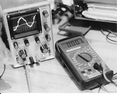 If you don't have one already, get a multi-tester. Any cheap brand will do, as long as it has the ability to test AC/DC voltage, milliohms, and up to 10 A (mine happens to have a tester for diodes and transistors also). Another invaluable tool when testing frequencies is an oscilloscope, and seen in the picture is the frequency being pulled from the air!