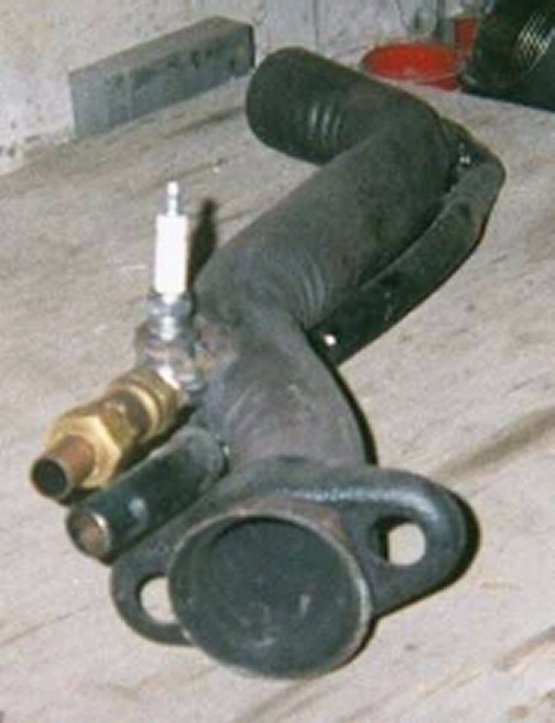 The "hot" end of the chamber. The brass fitting is fitted with a piece of copper pipe which will accept a high-temp neoprene hose to connect it to the Mixer. The plasma plug is mounted into a bung on the side, and the tip is made to touch the side of the rod. The whole unit MUST be tested for air leakage for at least ten minutes to make sure everything is sealed properly.