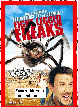 7.14.02 - Well, once again all my entries were lost forever. Anyway, a bunch of movies came out on Friday. One of theses movies includes the new thriller, Eight Legged Freaks. I honestly don't think that I have ever seen a more stupid looking movie ever. Just the title makes me want to stomp the creators face into the dirt. Just listen to it. Eight Legged Freaks, Eight Legged Freaks, Eight Legged Freaks... Now that I am thoroughly infuriated, there is one movie that looks good. I'll give you a hint, stab, stab.
