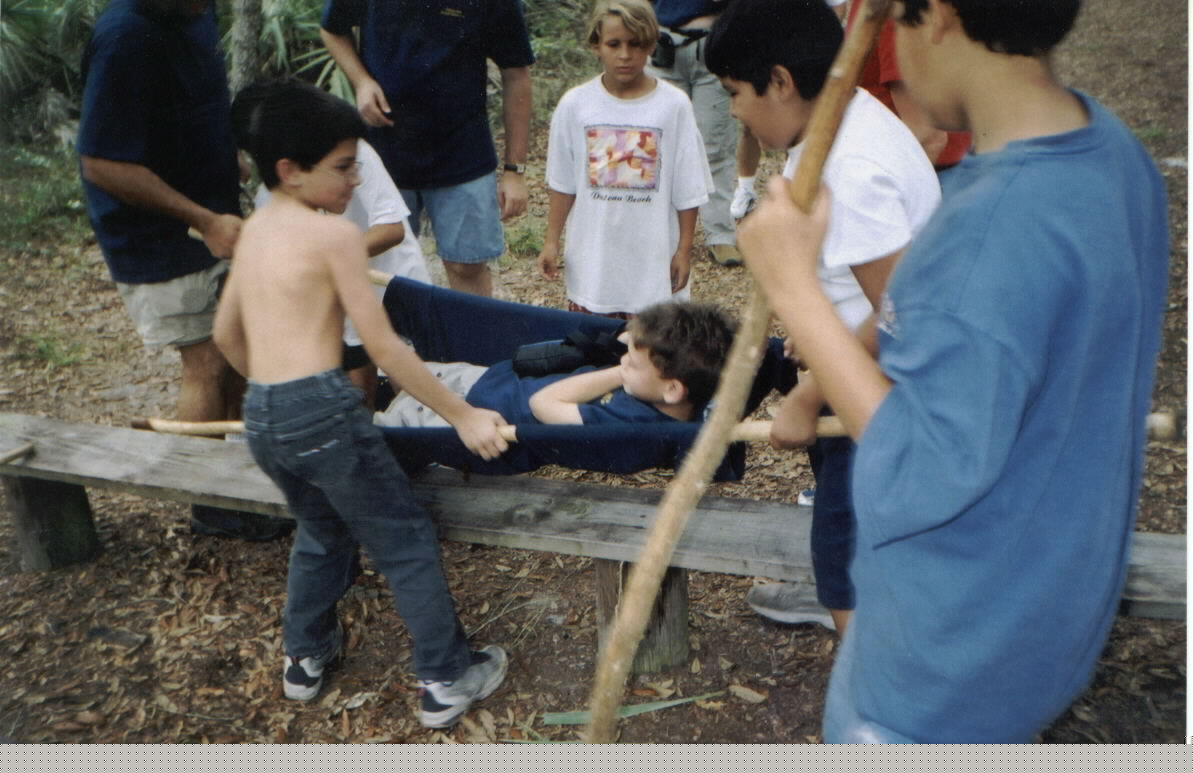 Begin at the pavilion. From the pavilion follow the road to the right of the flag post. Go past the Shoshone tribe and be very quiet as they don't like noise.Go right at the fork to the shower by the Tomahawk Lake. There is an invisible scout in the water and he needs help. Take the life saver on your left and throw it to the scout (the pole in the water). When everyone has had a turn to Big Chief Jim Pike for some important information. Proceed around the lake on the road til you reach the rapids. The sound you hear is the ancient Indian Spirits washing their plates! Guess how long it will take for a piece of wood to flow from the start to the end of the rapids? Go back to the tree near you and turn right and cross the old poachers bridge. Watch out for snakes and jumping alligators. Follow the path to the left along the river of no return. At the narrow wooden bridge over the river on your left, crawl on all fours across the bridge to avoid the head hunters poison dart. You are now in Paute territory. Go left. Follow the bank of the river of no return and go right at the two trees at the narrow wooden 15 plank bridge over the trail of the Amazon Python. Follow the path to the right of the campsite. At the Pima campground you will come to the pirahna river. The only way to cross is to swing across using the rope. Go past the Pima post and follow the road to the Wapache tribe. Here you will follow the arrows on the ground and cross the fire pit of doom in single file. DO NOT LOOK DOWN! Follow the arrow back to the road and go right. Take the first road to your left and follow this to the Navajo tribe. There is a very big sulfur marsh and the only way to cross it is to follow the Albino snake rope with your EYES CLOSED! Follow the arrow on the ground back to the road. Turn left at the road and follow it to the tribal hut. The smallest member in your group has just broken his leg! Make a stretcher using two poles and two shirts. Carry the injured cub to the end of the trail at the prayer circle! SUCCESS! You have now completed your challenge