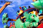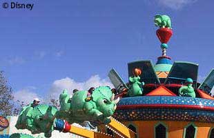 You'll probably remember this kind of ride from the Magic Kingdom, where you'll find Dumbo and Aladdin's Carpets that are the same style rides. Climb aboard one of the four-passenger vehicles and off you go on a trip above DinoLand U.S.A. There is even a surprise waiting for your kids coming out of the giant tin top at the hub of this ride. |