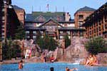 Another one of Disney's Deluxe Resorts. This time it comes in the shape of a pacific northwestern lodge. Well okay, it's a little bigger but otherwise it's pretty much the same. Disney's Wilderness Lodge is located in a pine forest at the Walt Disney World Resort and Old Faithful spews it's load up in the sky several times a day. The pool looks like it is carved out of rock and the multi-story high lobby is filled with totem poles and other relics that you would find in the pacific northwest. As any other Walt Disney World Resort Hotel not connected to a Monorail you can hop on one of the Disney Busses. For you as a Disney Resort guest it's free! The Magic Kingdom can be reached by ferry also. If you reside at the Wilderness Lodge you get access to such great recreation facilities like five championship golf courses, a health club, Three different kinds of Pools and much more. |