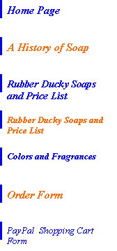 Home Page | A History of Soap | Rubber Ducky Soaps and Price List | Rubber Ducky Soaps and Price List | Colors and Fragrances | Order Form | PayPal Shopping Cart Form