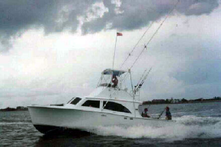 She's a 32ft Custom Fiberglass Prowler, twin engine diesel powered, she is a day boat design Flybridge Sportfisherman that raises fish at her transom. She fishes four anglers with her crew very comfortably. V-births forward a dinette seats four a full stand-up head w/lavatory mid-ship. Fighting chair or Rocket launcher state of art electronics, International Fishing Equipment. Our charters include our USCG licensed Captain and a Mate with years of local fishing knowledge, experience and proven technique. PROWLER BOATS have been known for decades as a truly seaworthy boat. They are comfortable in various weather conditions their tradition as a fast, fishable vessel is known world wide. The " Her Grace " is a Classic that says ~ " Come Play with Me! " The Evolution of the Sport-Fisher MARLIN MAGAZINE . . . Jan 2000 In a sense, it could be said that poor fishing shaped the modern-day big-game fishing boat. This paradox applies equally to the development of the long-range sport-fisherman on the West Coast and to the fast, nimble fishing machines that populate the Atlantic coast. Then, as now, the impetus has always been the search for better fishing. Tuna, more than any other species, can be credited with pushing the development of today's fishing equipment. Considered the epitome of big-game fishing, giant tuna are responsible for many of the early innovations. The two-speed reel, aluminum tower, transom door, aluminum outriggers and modern fighting chair were all developed to chase giant tuna in the Bahamas. The bluefin tuna had just as great an impact on the sport-fishing boat itself. As you can see by Tommy Gifford's description of his ideal boat from Anglers and Muscleheads, he recognized the advantages of a fast fishing boat early in his career. "With the Stormy Petrel I can twist, turn, reverse my course and jump to high speed in a matter of seconds," wrote Gifford, explaining his need for a fast boat to pursue tuna into the shallows. Over the next few years, builders such as Forest Johnson of Miami (who built the first fast sport-fisherman, the Prowler),followed by Rybovich, Merritt, Jim Smith and Bertram began building special-needs boats offering the range, maneuverability and speed necessary to take giant tuna in the Florida Straits. Because the winners of Cat Cay's ultra-competitive tuna tournament were those that reached the fish first, these boats crossed the 30-knot threshold as early as the early '50s. In the early '60s, blue water fishing was still pretty good along many of the East Coast's most storied fishing grounds, so you didn't need more than a 20-knot day boat to catch fish.