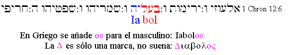 se lee DJahbolos, Jehovah y Baal Desde el principio el jefe de los ángeles caídos es llamado Satanás - el adversario- y Jahbolos, el homicida (Juan 8:44). Este Jahbolos se escribe Diabolos, pero la D es una marca, no se pronuncia, por lo que DiaboloV se pronuncia Jahbolos, un nombre de 3 sílabas, como también lo es SatanaV, lo cual en lenguaje numérico es 33 - tres veces tres, y en lenguaje gráfico son dos triángulos, en el cual se ven las Siglas DS, el doble triángulo, el 33, la cabeza del chivo bafomet, y muchos otros; es la estrella de David Remfan (no el padre de Solomon).