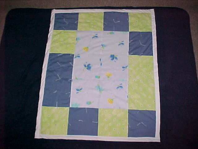 blue, lime green, and light blue patches with solid white backing - tie knot quilted with white thread