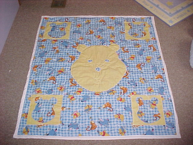 blue Winnie the Pooh and yellow cutouts with solid white backing - tie knot and hand sewn quilted with white thread