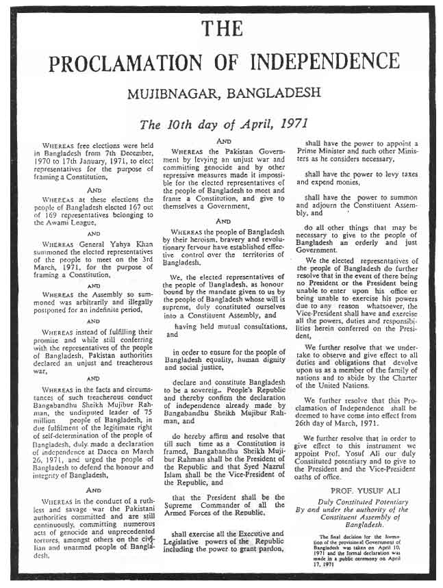 struggle for independence. At 7:45 pm on 26th March 1971, Major Zia under the direction of Bangabandhu Sheikh Mujibur Rahman, from Kalurghat radio station, Swadhin Bangla Betar Kendra broadcasted the declaration. "This is Swadhin Bangla Betar Kendra. I, Major Ziaur Rahman, at the direction of Bangabandhu Mujibur Rahman, hereby declare that the independent People's Republic of Bangladesh has been established. At his direction, I have taken command as the temporary head of the republic. In the name of Sheikh Mujibur Rahman, I call upon all Bengalis to rise against the attack by the west Pakistani Army. We shall fight to the last to free our motherland. By the grace of Allah, victory is ours. Joy Bangla." Major Zia's message was picked up by a Japanese ship anchored mid-stream in Chittagong harbor. When the news of this declaration was broadcasted by Radio Australia, and The Statesman Delhi of 27th March 1971 the rest of the world came to know of it and this Declaration of Independence became instrumental in the struggle for independence. The Proclamation of Independence from Mujibnagar was established on 10th April 1971. On April 17, 1971 in Mujibnagar under Kushtia the Provisional Government was formed and took the oath of office. Syed Nazrul Islam took over as the acting President and Tajuddin Ahmed got the portfolio of the Prime Minister.