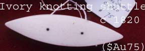 Because this was a pastime of the upper classes, these shuttles have to be amongst the most beautiful and ornate of all the shuttles that I have seen. Mind you there are some very beautiful tatting shuttles around too. But a shuttle with gold filigree and enameled pictures take a lot of beating. (Surprise, surprise, I do not have one, or even a picture of one to show you. I think they would cost a lot of money. I could make one of course, but out of plane old wood... no way! It would be an insult to a most beautiful tool) See page 66 of Neryllas book, or go to the Wallace Collection in London. Oh look, I have found one from Neryllas collection. You cant really see that it is a knotting shuttle, but it is. ( and , of course, it is a plain one).