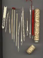Here you can see some bone (?ivory) tools, along with the metal tools and a netting needle case. On the far left is a wider "closed" needle with the tongue as a reservoir. There are two bone "pins" too, the ones with knobs on. I don't know how these were used. :( Finally here are the meshes or gauges.