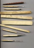 NETTING NEEDLES. In my self styled position as Lace Bobbin Historian ( I am really proud of my humility!) I am often consulted on a variety of tools that "look like" bobbins of some sort, and this is how I came across these delightful tools. In fact I already had a large "netting shuttle" (as I had been calling it) in my collection, but this query set me researching, and this is what I have discovered. Netting clearly goes back into antiquity as it was the method that has been use for years to make fishing nets. In more modern times they were used for making camouflage for military objects and installations (OK, I am not as old as to remember WWI for you who want to be cheeky!) But I think that what you will be interested in is the decorative use of netting. You can find examples of decorative netting used on many things ranging from delicate covers for small pin cushions, to beautiful overlays on just as beautiful dresses. They were made with a variety of needles made from both metal or bone (oops and Ivory too) their sizes varied in length (immaterial) and width which is more important as the size of the decoration is more or less dependent on the size of the needle that can go through the "mesh" hole. This leads me to the second tool that is needed for netting, and that is a "mesh". This is a flat piece of wood or bone (oh yes, I forgot again, Ivory too) of varying lengths and widths which is used as a gauge for the mesh holes. In fact they are sometimes called mesh sticks or gauges. The needles that are narrow have open ends and the fiber being used is wound around them as a reservoir (like the winding post of a shuttle). The wider needles are essential flat with closed ends and a internal "tongue" that is used as the reservoir. Ok, are you ready to have a look at them?