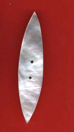I have never seen a Fern ware shuttle. they used ferns from the Isle of Arran to decorate their ware. They stuck a fern frond on the wood, covered it with pigment, removed the fern and outlined it by hand, then a final coat of lacquer= NO pics. I do know even if Fern ware shuttles exist. MOTHER OF PEARL These just have to be beautiful shuttles. Now I have made a couple I can tell you a bit about them. (Made two MoP shuttles and I am now the worlds expert!!) I now realize why they are so thin, the reason is that it is very hard to find a natural curve on the shell that is anything other than shallow. I have one shell, and I could only get one natural curved shuttle from it. But what I did discover is that the thick part of the shell can be cut and carved to a suitable curve (still quite shallow) and then even that thick part of the shell will polish up like the natural shell finish. (Well, not quite as nice as that, but still very nice) What surprised me was that it smells like burnt bone when you are cutting and grinding it. The making of MoP shuttles (as with bone) id=s cut, carve, fit; cut, carve, fit. Very tedious and painstaking. this is because there is no natural flex in the material. Mother of Pearl is an excellent inlay, and you would have seen that on may shuttles. David Reed Smith, (my shuttle teacher) has made some great MoP inlaid shuttles. The antique shuttles were plain or engraved, some monogrammed. Just lovely. So bright, so smooth.