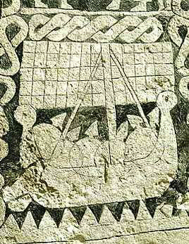 Ancienne gravure sur pierre viking illustrant un drakkar. Notez la grande toile cousue de petites pièces carées ainsi que les gros motifs illustrant des torsades de laine et les zigzags représentant les vagues.