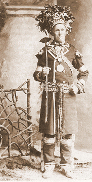 Le grand chef Huron Maurice Bastien (vers 1800) dans sa veste militaire et sa ceinture fléchée.