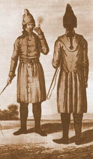 1780, un autre soldat allemand, devenu garde forestier à Québec, fait des croquis de paysans canadiens portant leurs ceintures à la taille.