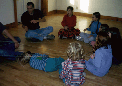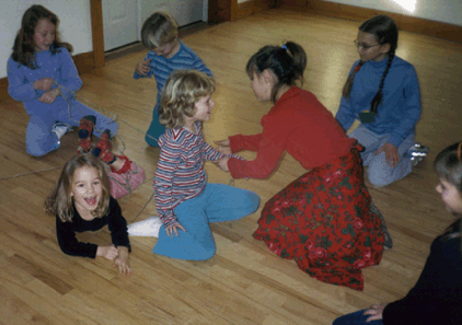 Someone, as the Starting Point to the Story, simply, begins:  “Once upon a time,” for example, “there was a young girl who was entering the woods … .  She had been told, by her mother, not to because –“ and this someone tosses the ball of yarn across the circle to another Storyteller.  Of course, he holds on to one end of the yarn … and, of course, the new Storyteller continues: “There were monsters in the woods – werewolves and vampires and wild animals … .