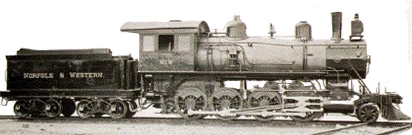 All of this activity was financed by a mortgage of all VO&L property, including the leasehold and rights of way, to the Southwest Virginia Trust Company of Roanoke for $300,000. On 1 January 1906, the VO&L procured, on a lease-purchase agreement, one narrow gauge (three feet) 35 ton Class B steam engine, shop #624, from the Climax Manufacturing Company of Corry, Pennsylvania, for $6,600, with delivery to be at Philpott by N&W railway (Henry County Trust Deed Book #2, page 317). About the same time, the VO&L purchased outright a used standard gauge Baldwin Consolidation 2-8-0 from the N&W. These engines were of the types shown in the following photographs.