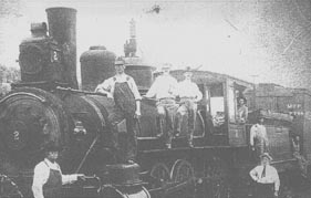 All VO&L rolling stock was constructed at the company shops in Fayerdale using wheel sets and other parts from foundries along the New River. The standard gauge roster probably included a combination passenger/freight car ("combine"), box car, flat car and several shallow gondolas. Narrow gauge cars consisted of skeleton log lorries, and perhaps one or two flat bed tool transports. The following photographs show the actual VO&L trains and their crews. Note that the logging rail ties are laid directly on the ground with no ballasting.