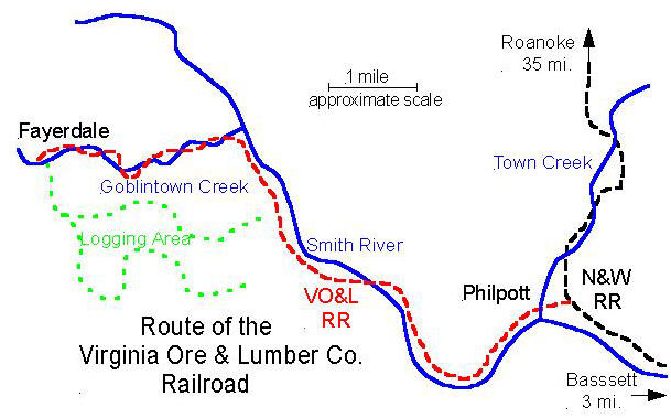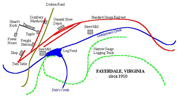 Beginning soon after the Hill and Lafferty purchase, Fayerdale blossomed into a booming mining and logging town. The mining operations in Stuart's Knob were mechanized with pneumatic drills, electric lighting, iron cart railways, and a tramway, all powered by steam driven generators and winches in a new power house. The confluence of Hale's and Goblintown Creeks was scooped out to form a log storage pond serving a modern bandsaw mill. Twelve miles of standard gauge rail was laid along a snaking right of way along Goblintown Creek and Smith River ravines to the Norfolk and Western main line at Philpott, and stretches of three foot narrow gauge track were run from the log pond dump ramp to cutting sites in the surrounding forest. Other construction included a company office building , freight station, blacksmith and carpenter shops, an ore tipple, a warehouse to handle whiskies and brandies for the DeHart Distillery in nearby Woolwine, and numerous dwelling houses, stables and other ancillary buildings. This drawing illustrates how Fayerdale was probably configured about 1910, the heyday of its brief existence. The light weight logging track followed the cutting sites as they migrated through the rapidly wasting forest.