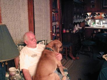 Ok, go ahead and laugh! This is embarrassing but might as well tell all. You see, I love to be cuddled and I sometimes forget that I'm not one of those little pups that can climb up on a lap when they need a hug. (Well, I used to fit up there!) Mz. Ronnie caught me in Daddy's lap while she was visiting. Sometimes, he lets me take a nap if I'm real still. (yawn). Butch "the big black dog" gets upset when I do though. He's my older doggie friend and he's the boss around here.
