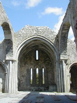 At the east end there is good vaulting and the three lancet east windows are surmounted by a single small lancet. On the left is a possible double sedilia with decorated columns. Beside this is a tomb-niche with a recumbent figure. This is the effigy of Conor na Siudaine O Brien, one of the abbey’s great benefactors, who died in 1267. Opposite it is another decorated double sedilia. The chancel-arch has columns with decorated capitals and bases.