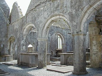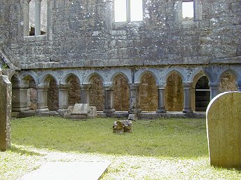 There are several two-light windows in the south wall of the chancel. Some of them have cusped ogee heads. There is a good five-light traceried east window. The cloister to the north of the church has a ten bay arcade on each side except on the east where there are five bays separated by substantial masonry pillars and a small half bay. There are many two-storey buildings surrounding the cloister and to the north. Many of them have fireplaces but the upper floors are missing. One of these buildings has a large fireplace on the ground floor with a large oven behind it. Beside it is a deep circular stone pit, which was apparently a fish holding-tank.