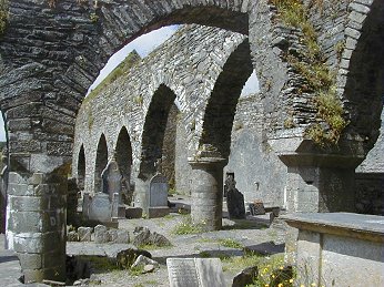 There is a tall thin central tower. It has no vault. The sacristy to the north of the church contains a fine bullaun stone. A long two-storey building with a basement runs north from the sacristy. The cloister lies to the north of the church. The cloister arcade is divided into three-light groups with possibly three groups along each side. Only one corner has been reconstructed.