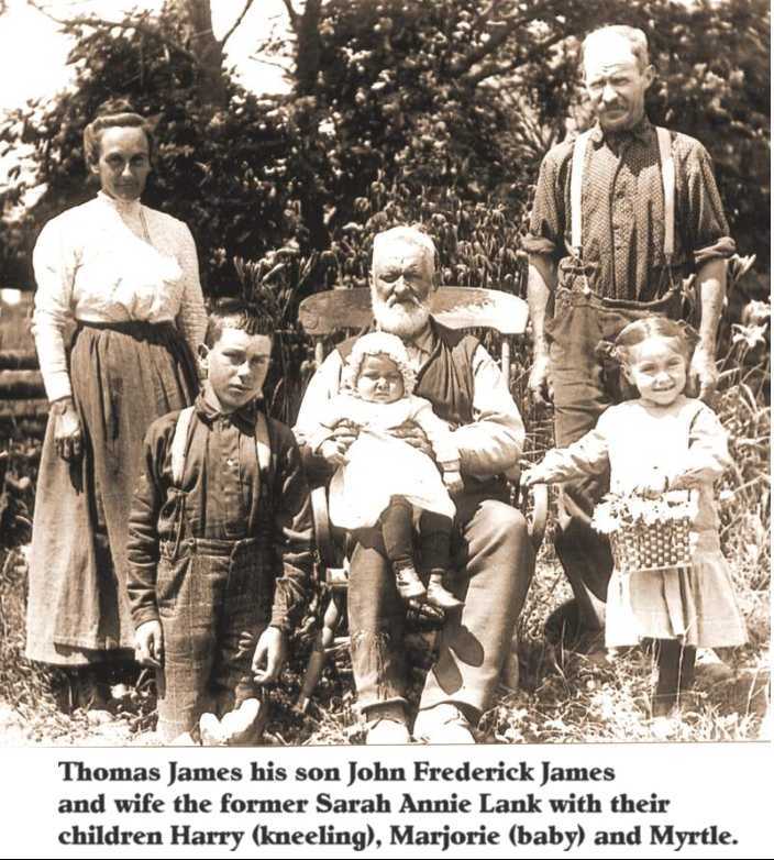 29. John Frederick(5) James (Thomas(4), John Calf(3), Thomas(2), Edward(1) was born October 18, 1877 in Mara, North Ontario County, Canada, and died September 16, 1956 in Port Hope, Ontario. He married Sarah "Annie" Lank May 29, 1901 in North Orillia, Medonte, Ontario, Canada, daughter of Arthur Unknown and Mary Lank. She was born November 24, 1877 in Aslackby, Lincolnshire, England, and died March 02, 1957 in Guthrie, Simcoe County, Ontario, Canada. Children of John James and Sarah Lank are: