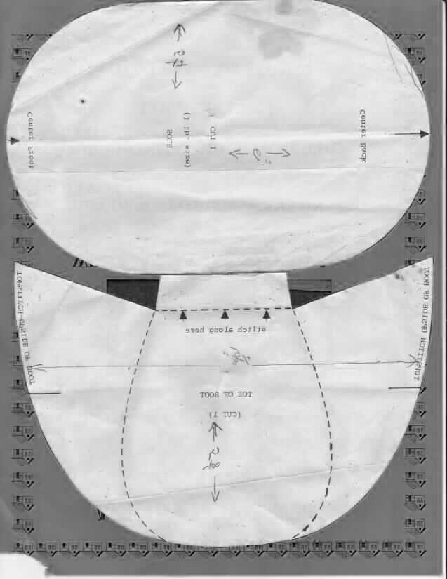 Basic Directions. 1 Empty coffee can, 1 lb. size complete with plastic lid. 1 white shoe lace 9" x 30" piece of fabric 1. Pin the four pattern pieces for the boot on the fabric and cut out your pattern. 2. With a pin, mark the center back of the sole of boot, also pinmark the center back of the boot. Working from the center to each side, pin the side and back piece to the sole and top stitch into place. 3.Mark the center front of the toe and the center front of the sole of the boot. Working from the center to each side, pin and top stitching up the sides of the boot as shown on the pattern of the toe. 4. Sew tongue into place as shown, on the pattern of toe, by topstitching into place. 5. Punch three holes on each side, put lace through. 6. Fold down 3/4" on the top of the boot to form a cuff. 7. Place the coffee can into the boot.