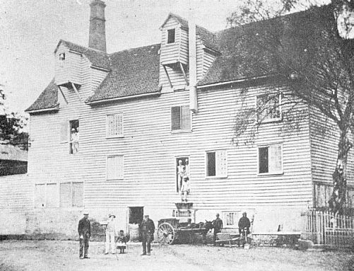 Langford Mill, near Maldon, Essex, England, which burned down in 1879. The picture is interesting because it shows the number of workers (11 seen in the photo) in the mill and a donkey cart standing below the sack door on the front floor.