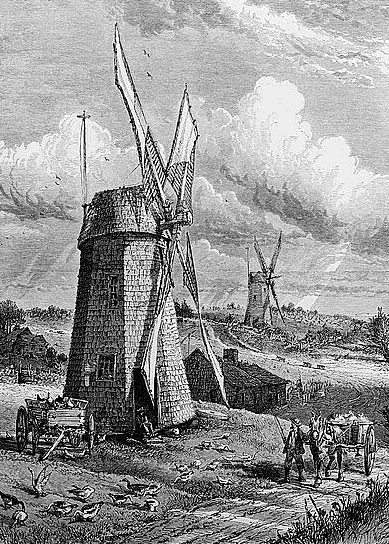 Robert Leslie's description of the flour mills in use in England must have been a great surprise to Oliver Evans. He could not have realized up until this time the great dissimilarity of construction between the mills of England and those in America. The slender smock, post, and tower wind mills with their small floor space, did not lend themselves to the adaption of the Evans automated flour milling machinery, as did the more roomy stone mills of America. Under these circumstances there could be little hope of introducing anything new in this business to the British millers, who were suspicious of anything novel a, as were their American cousins in a like situation.
