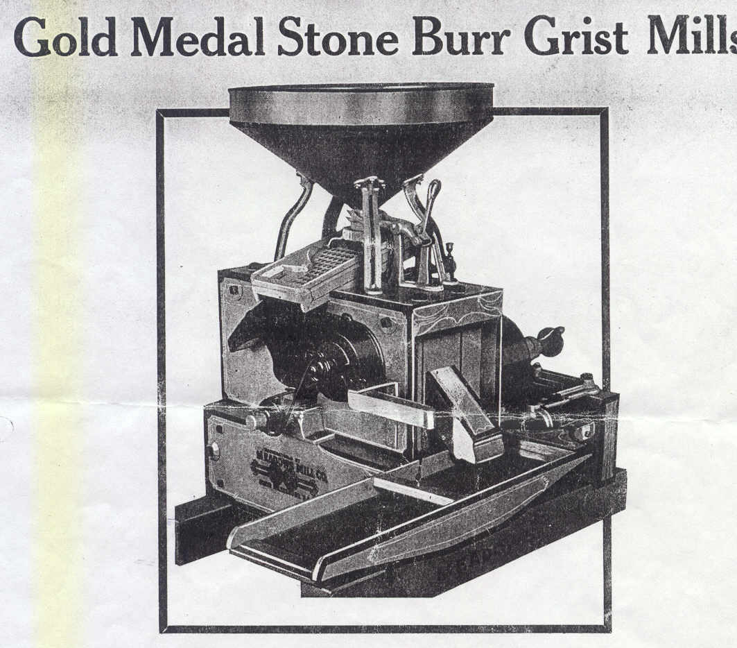 Photo Number: #18. Floor Number-Item Numbers: 1/5. (See: Floor Level 1. First Floor Plan-"The Road level") Items in Photo: Corn mill.(burr mill). Provenance - Manufacturer (if known): Stone Burrs. Meadows Company, North Wilksboro, North Carolina. Dimensions, Yield, Capacity, Output, and Additional Information: (Diameter of millstones and output not available at this time). Catalog Documentation: "Meadows Mills: The First Hundred Years," by Marty McGee, Meadows Mill Company, North Wilksboro, North Carolina, 2002. and Meadows Mills, Inc., P.O. Box 1288, North Wilkesboro, NC 28659 800-626-2282 or 336-838-2282 http://www.meadowsmills.com/