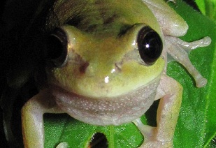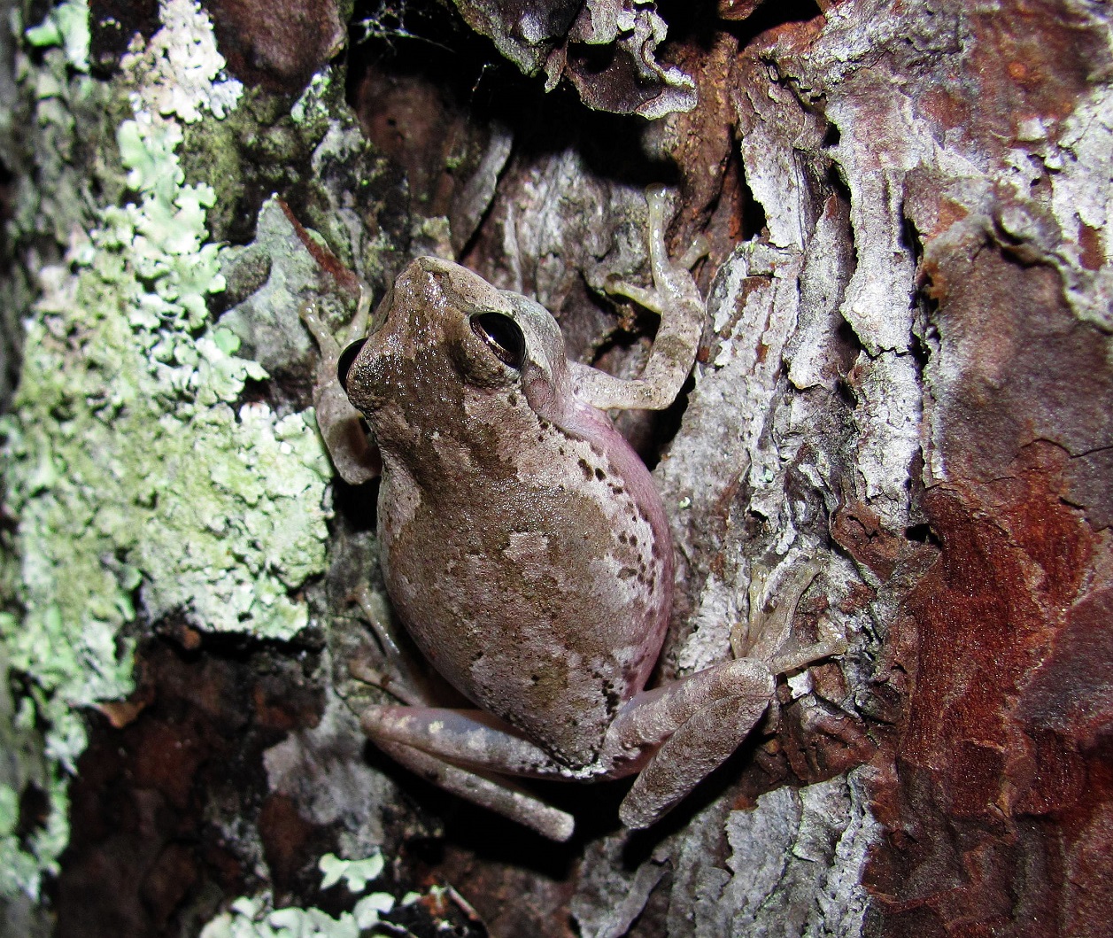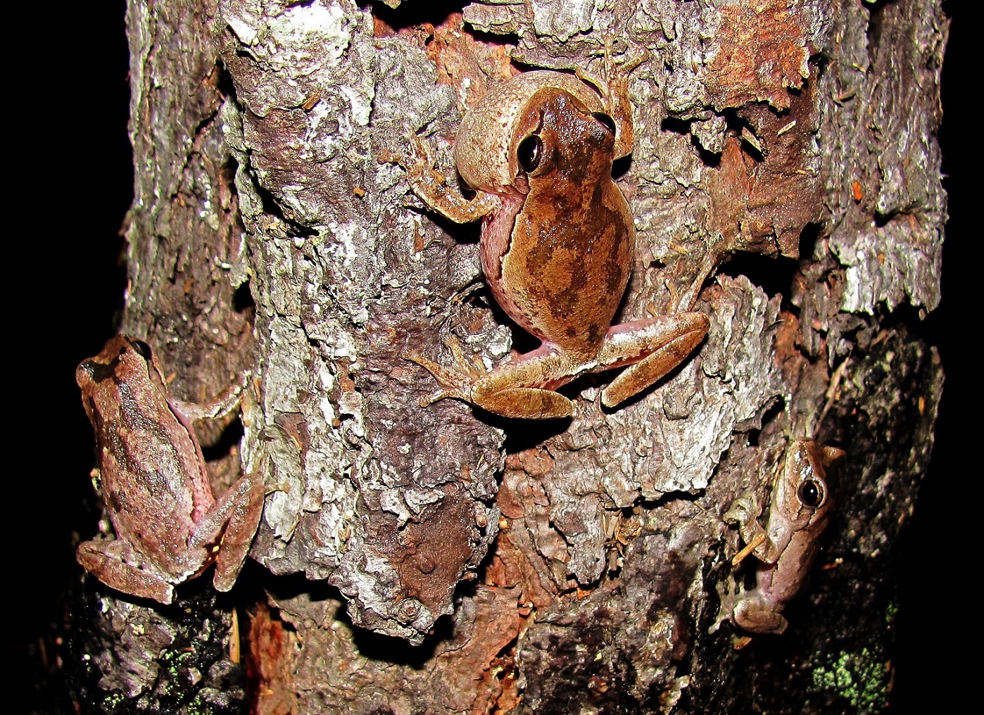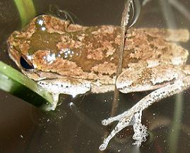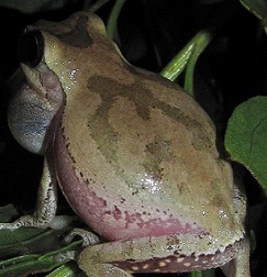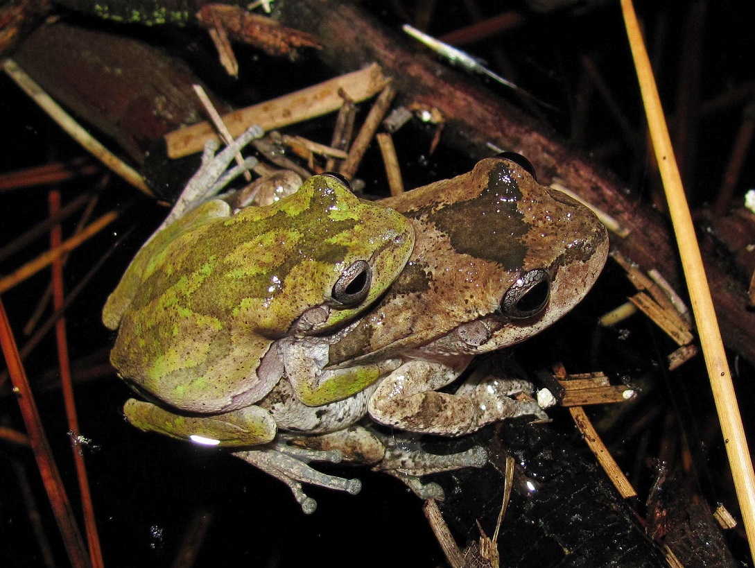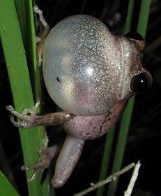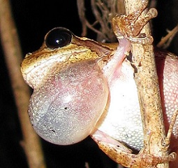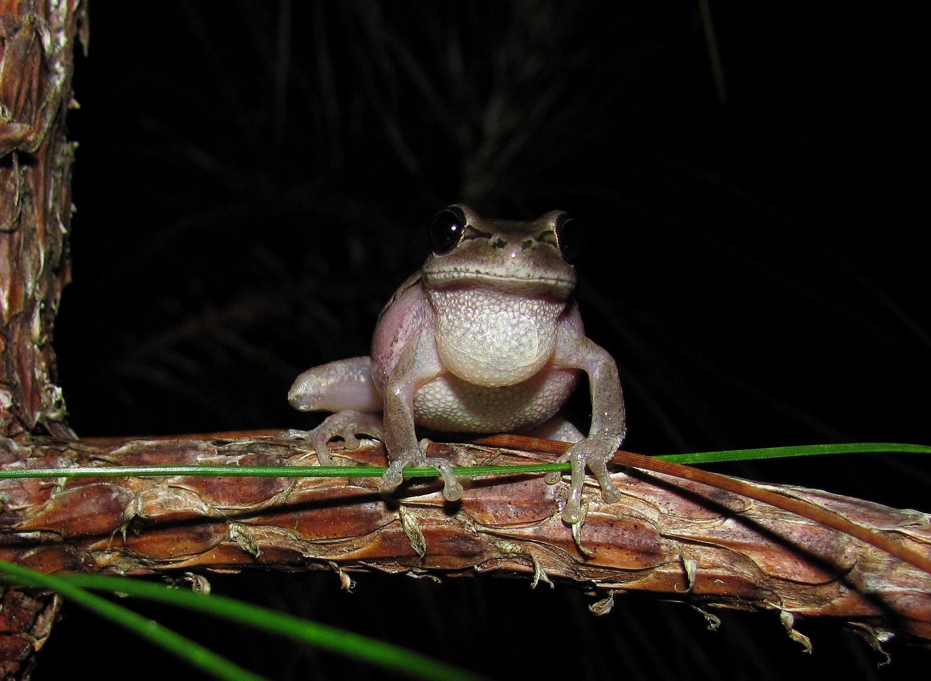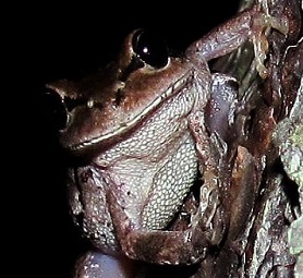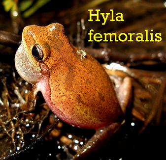 Hyla femoralis. These seem to breed in more acidic water, and come to civilization a little less often than others, but they are still fairly common, and can be heard calling from a variety of places, especially ahead of a storm! Their call is "Morse Code"-like, and can be easily recognized as they call from the wooded shoreline of a marsh or small pond, or from the trunks of trees standing in shallow water. These were taken near St. Augustine, Florida.