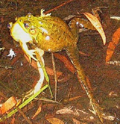 This is a territorial dispute between two males (Rana c. melanota)! This little "rough and tumble" venture in itself is usually quite harmless..... but the sudden late-night burst of activity may well attract the attention of a nearby Raccoon, which may pause long enough to snatch a quick frog dinner! (Photos submitted by Georges Huard).