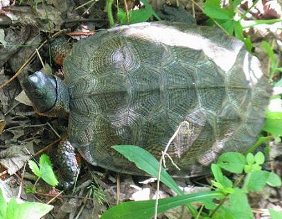 This is the most common turtle throughout Pohoqualine! In the cooler months they stay in the stream or it's smaller, marshier tributaries, but by Summer, they wander far afield, and it's not uncommon to see one munching on a wild strawberry, or eating a garden slug on a wet morning (cloudy days are best for picture-taking, unless I'm going for butterflies!). Even though I breed Wood Turtles, mine are all long-term captives, and fear spreading "captive" diseases and such to any would-be new introductions, so turtles are left strictly alone when encountered..... except to get their picture :-). This one was seen in McMichaels.