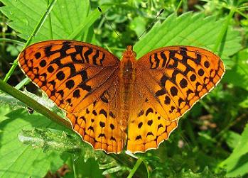 This is the Great-Spangled Fritillary. One thing interesting about this butterfly is the males appear almost a month before the females appear! The name "Great-Spangled" means it's a LARGE fritillary (about 3 inches), and the hindwings on the under-side are spotted with vivid bright silver dots! Normally seen in the open, the females go deep into the forest to lay eggs on the leaves of violets, and the larvae feed at night, and grow quite slowly for a butterfly caterpillar!