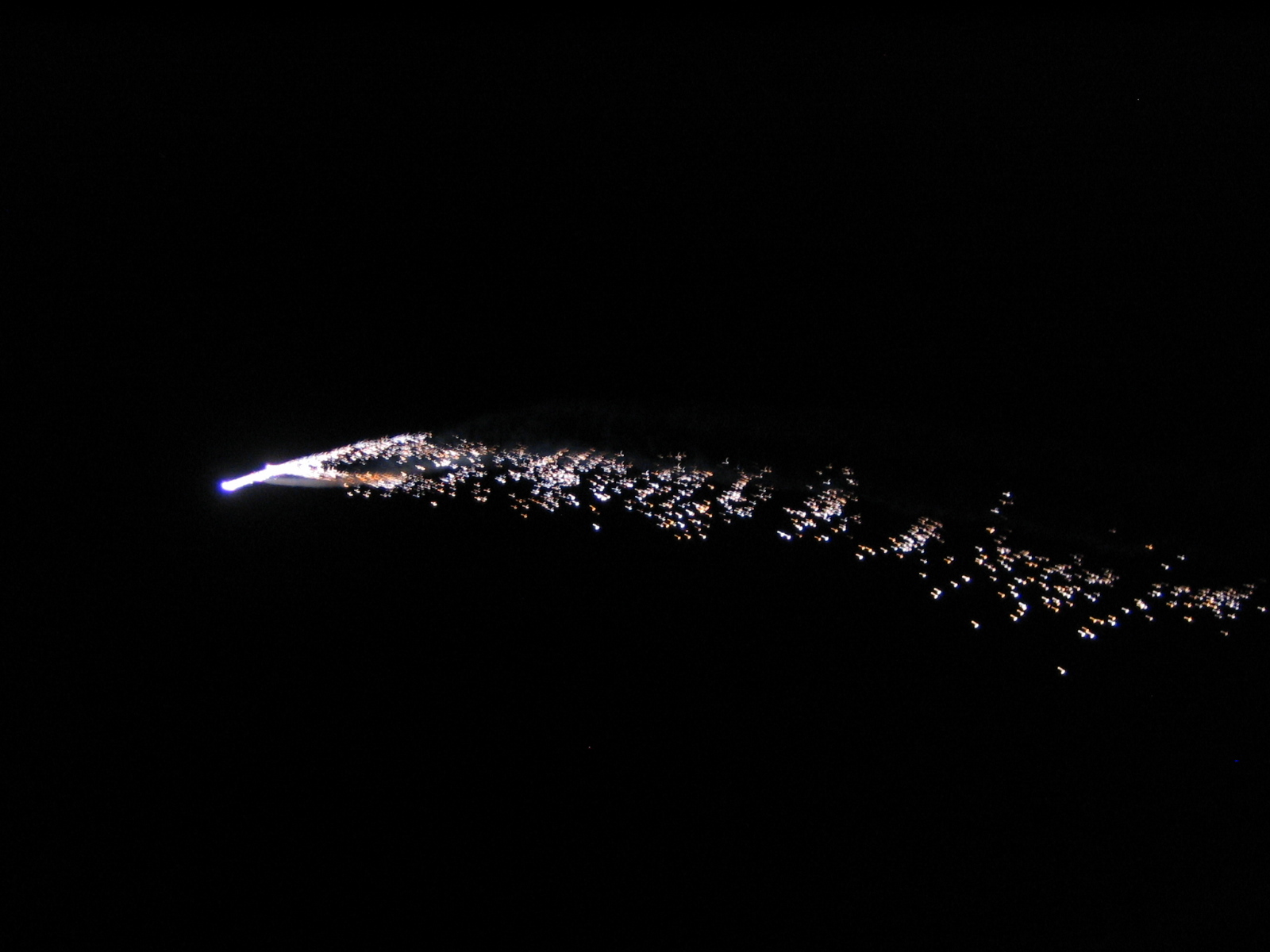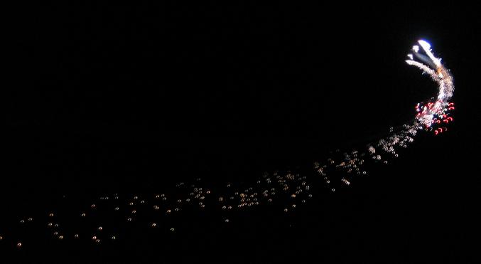 Believe it or not, the really DO shoot fireworks from airplanes! The plane is in the upper right corner, with fireworks trailing behind.