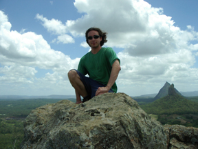 Jamie at the summit of Mount Ngungun, with Mount Coonowrin in the distance.