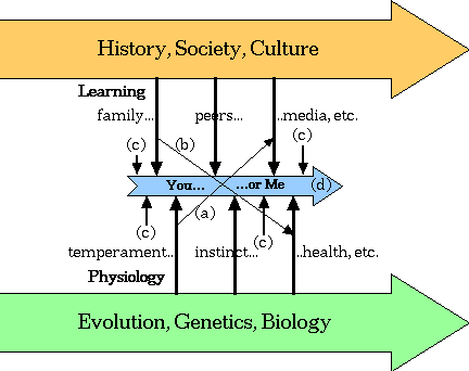 What you see here is "poor me" (or "poor you"), at the center of enormous forces. At top, we have history, society, and culture, which influence us primarily through our learning as mediated by our families, peers, the media, and so on. At the bottom, we have evolution, genetics, and biology, which influence us by means of our physiology (including neurotransmitters, hormones, etc.) Some of the specifics most relevant to psychology are instincts, temperaments, and health. As the nice, thick arrows indicate, these two mighty forces influence us strongly and continuously, from conception to death, and sometimes threaten to tear us apart.