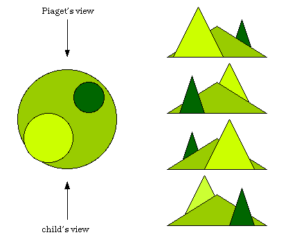 Similarly, younger children center on one aspect of any problem or communication at a time. for example, they may not understand you when you tell them “Your father is my husband.” Or they may say things like “I don’t live in the USA; I live in Pennsylvania!” Or, if you show them five black and three white marbles and ask them “Are there more marbles or more black marbles?” they will respond “More black ones!”
