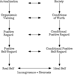 On the other hand, to the extent that our society is out of synch with the actualizing tendency, and we are forced to live with conditions of worth that are out of step with organismic valuing, and receive only conditional positive regard and self-regard, we develop instead an ideal self. By ideal, Rogers is suggesting something not real, something that is always out of our reach, the standard we can’t meet.