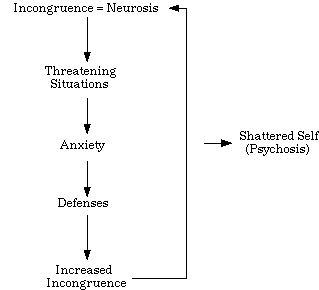 Unfortunately for the poor neurotic (and, in fact, most of us), every time he or she uses a defense, they put a greater distance between the real and the ideal. They become ever more incongruous, and find themselves in more and more threatening situations, develop greater and greater levels of anxiety, and use more and more defenses.... It becomes a vicious cycle that the person eventually is unable to get out of, at least on their own.
