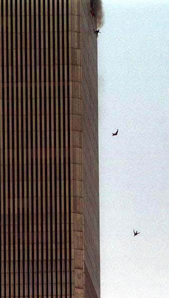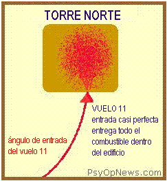 La torre Norte fue golpeada primero, a las 8:46, de frente, y todo el combustible se derramó dentro del edificio; la Torre Sur fue golpeada después, a las 9:03,por un lado, y gran parte del combustible se quemó afuera