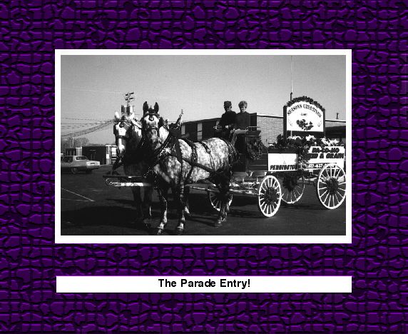 | In the fall of 1986 Frankie found a real full-time job for me - when we got into the Percheron Draft Horse Business. We started with one horse and gradually increased to showing a six-horse hitch in five states. Seven years ago Pennington Seed Company from Madison, Georgia, became a sponsor of our hitch. |