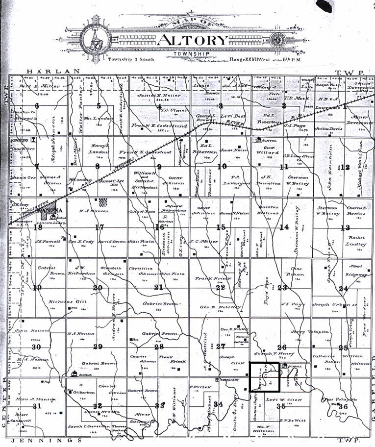 Nothing was owned in Altory at this time (1905), but the plot outlined in black in the lower right hand corner, partially in 26, and in 35, labeled "Barbara Cilek" is where I am told Fredrick Cristof's initial settlement was. That may explain the gap in Anna's story where she said they came to Decatur County in 1880, but did not homestead land in the Garfield Township until 1897, although, those dates may not be precise. However, on the Altory Taxpayer list it does show that at least from 1888-1892 they were still residents of Altory Township, but, by the time of the 1900 census, they resided in Garfield.