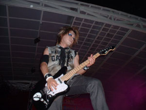 Last i left you , was when i had already arrived at Youth Park and am somehow seated rather comfortably on the floor with my bro. At around 4:30pm , DJ Randolf introduced an all Indian metal band , Rudra!! Wow..the support they got was great eventhough it was minority who actually got up and stood by the speakers and just head-bang away!! It was really satisfying!! Most of them were dressed in black and had their arms around each other's shoulders and were crazily head-banging away. One guy in particular i think had the security guards on duty worried. He was dressed in the all too famous "Mat Rocker" get up. The black leather jacket & tee plus jeans and the killer boots to match!! Throughout Rudra's performance , he had his arms stretched out like Christ on the crucifix(<-- sorry if any of you are offended by this description but it is the only way i can think of to describe his action!!) , head thrown back and had his tongue flicking in and out like that of a snake. I think he gave the Japs and the security guards quite a scare!! The security guards had their eyes on him throughout the entire performance!!