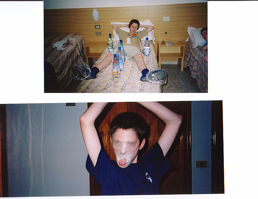 LOL....alright, these pictures are from my trip in Italy and my 2 weeks at Thunderbird ranch. The first picture is of my friend Alex. He fell asleep while I was in his hotel room, and so i decided to decorate him..he wasn't too happy when he woke up..lol..The second picture is another of Alex.One word: Bubblegum..