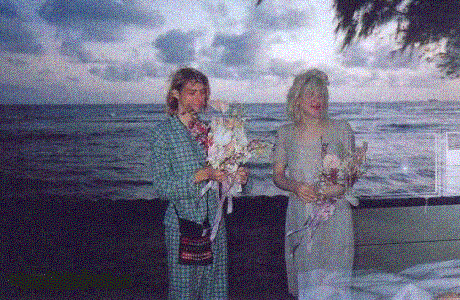 In January of 1992, Courtney found out that she was pregnant. Courtney did not tell Kurt until after their wedding, which took place on February 24, 1992, in Waikiki. Kurt and Courtney were married on a cliff next to the ocean. Kurt wore pyjamas and Courtney wore a green dress that once belonged to the actress, Frances Farmer. Though many said that Courtney had used heroin while pregnant, and Courtney even admitted to using it at her early weeks of pregnancy, Kurt and Courtney quickly dropped the habit when Courtney told her husband the news. Many thought that the baby would suffer due to Courtney’s heroin use in the early weeks of her pregnancy, but the baby was perfectly healthy. Kurt and Courtney refered to the growing child inside of Courtney as "The Bean", because of its kidney shape on the sonogram. On August 18, 1992, Kurt and Courtney’s daughter, Frances Bean Cobain, was born. As the legend goes, when Courtney went into labour she wheeled her IV stand with her all the way to Kurt’s room (he was in the hospital for rehab trying to kick his heroin habit) and demanded he join her for the birth of their child. In the delivery room, Courtney was trying to comfort Kurt while she was giving birth because he felt very sick. He passed out as the baby pushed through and Courtney shouted "You will only have one head". They had a perfectly healthy baby, despite all the tabloids claiming Frances was born as a mutant.