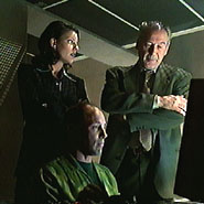 Immediately, the colored picture comes up of Raines’ face, and several other men, obscured by shadow, standing in the background. On the bottom left-hand corner, it says, [“Bola”, For Center Use Only and the date…three months ago.] Raines’ face moves back and we’re looking at the outside of some sort of meat locker. The camera pans forward, closer to the glass and we distinctly hear Bola’s voice screaming from inside. After a moment or two, we can see him as well, completely naked and raking his sharp claws against the metal door hysterically. There are several claw marks on the inside of the window as well.
