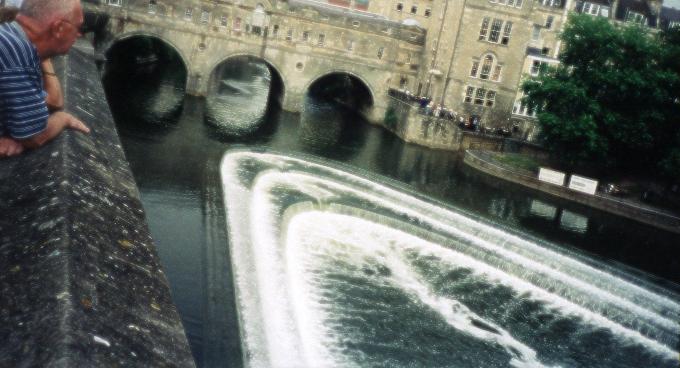 This is the river Avon. The bridge is the Pulteney bridge and there are little shops on it you can see them. We went down there where those people are you will notice in the next picture. Where that big tree is there is a pub. Nicole and I snuck off over there to have a drink.